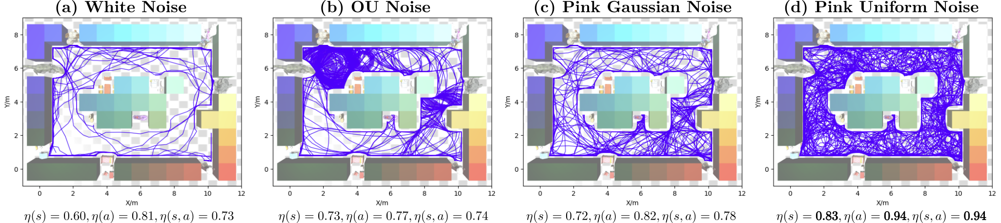 We further analyze this in simulation by visualizing exploration trajectories and computing the entropy. The figure below summarizes exploration coverage and entropy under different exploration noise settings.